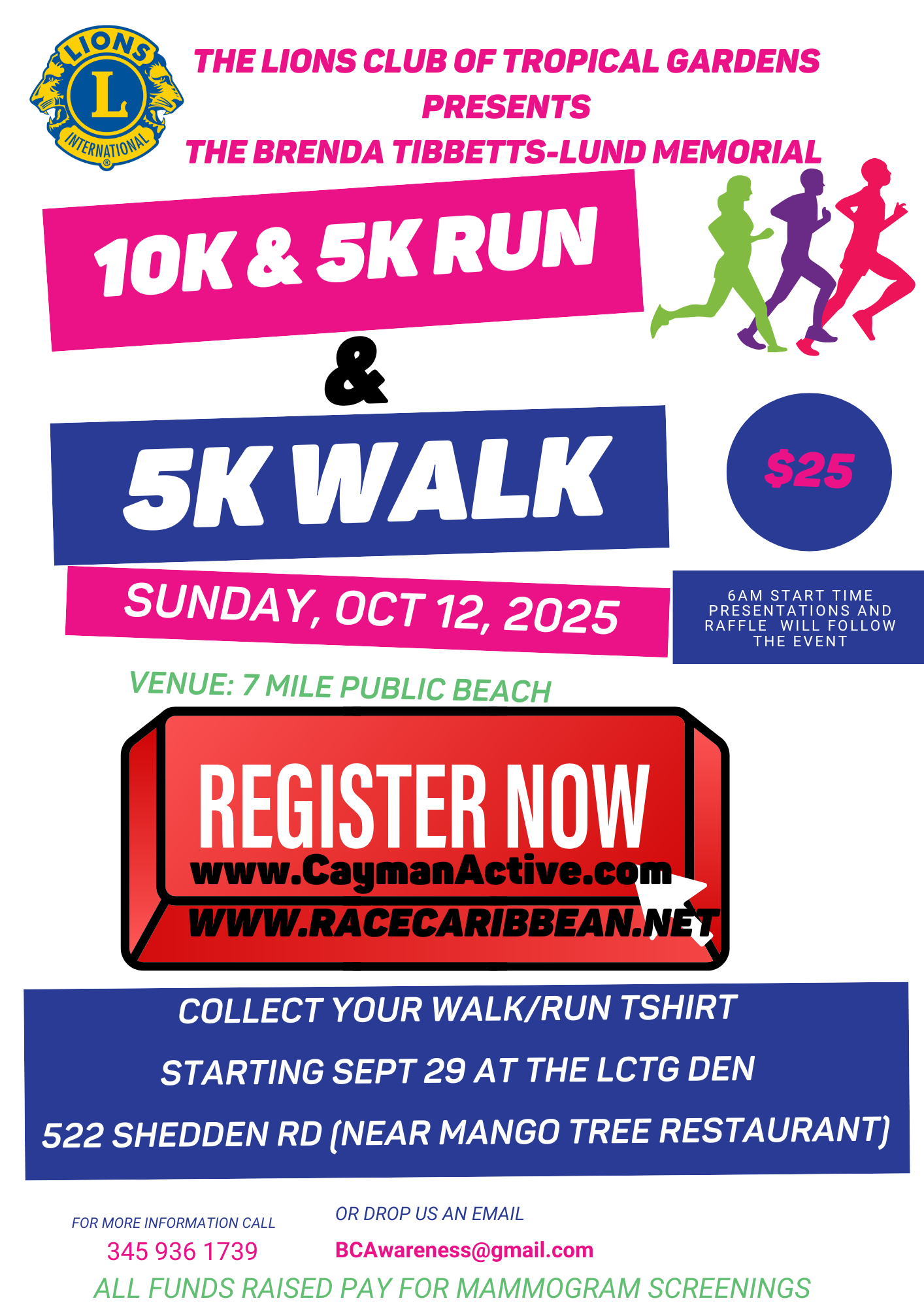 Register now for the Lions Club of Tropical Gardens Brenda Tibbetts-Lund Memorial 5k Walk and 5k/10k Run on Oct 12, 2025 at the Seven Mile Public Beach at 6am.