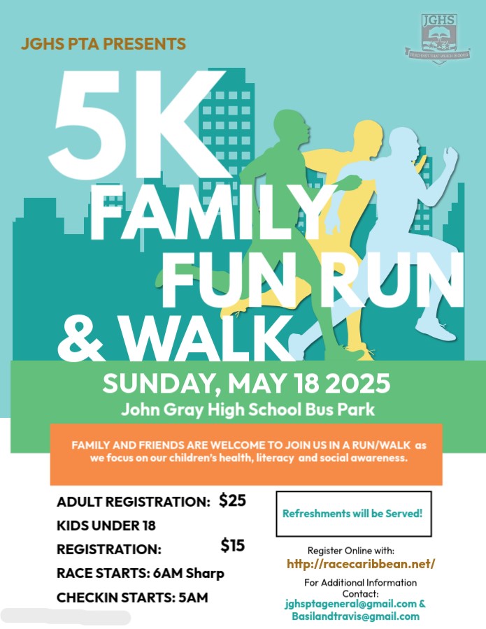 On May 18, 2025, John Gray High School PTA is excited to bring communities together to run, walk, and wheel in support of youth mental health and literacy. This year, our 5k Run/Walk event will benefit two incredible non-profit organizations: the Alex Panton Foundation and IReadforlife. Both organizations are dedicated to supporting our youth and making a positive impact in their lives.